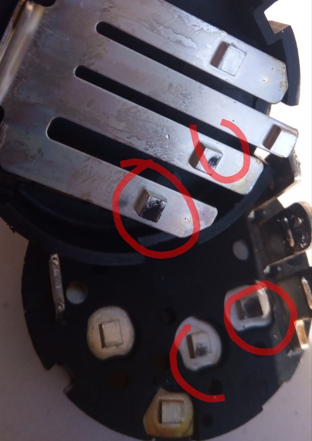 Beim alten Post ging ich davon aus, dass der Strom über die Stifte fließt. Diese drücken aber nur auf die heiß gewordenen Kontakte. Unter dem Zunder gab es minimalste Kraterchen. Waren mit feinem Sandpapier sofort weg. Ich denke es fehlte ursprünglich an Anpressdruck.