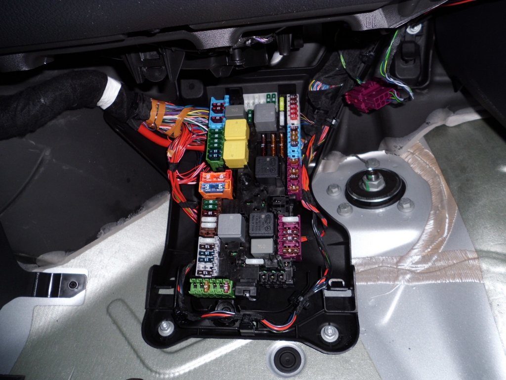 Unter dem Werkzeughalter auf der Beifahrerseite sitzt dann ein Kasten mit Relais und Sicherungen, Bild unten angehängt. Die violette Steckverbindung (keine Ahnung wofür die ist) die oben rechts baumelt hatte ich direkt mal in der Hand, weil sie nicht richtig gesteckt war