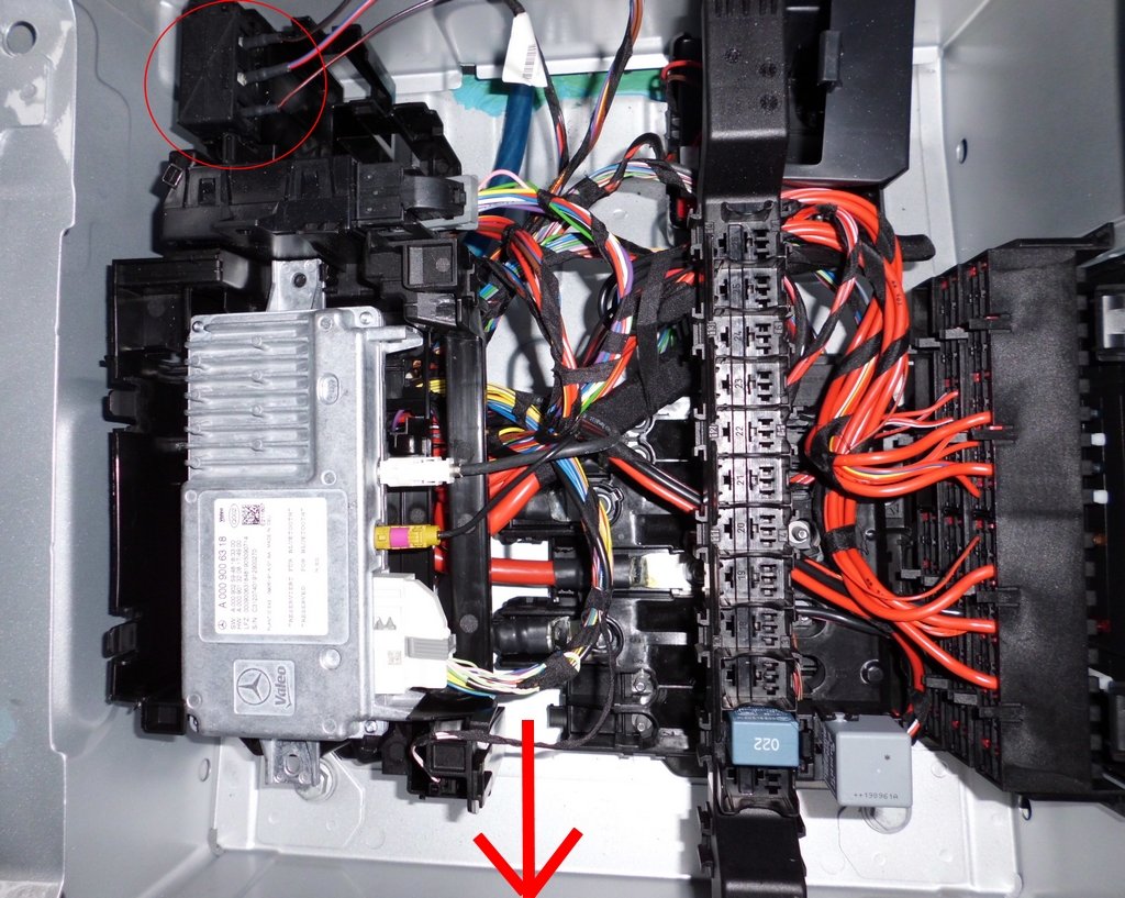 Ich hab mal ein Bild gemacht, die EK1 ist eingekreist, unten im Bild ist in Fahrtrichtung (Pfeil). Wenn du die EK1 vor dir hast mit den Kabeln nach unten abgehend ist D+ links - das steht aber auch auf S. 245 in den Aufbaurichtlinien die schon genannt wurden. Kabelfarbe könnte schwarz/rot sein, da bin ich mir aber nicht sicher! Ich habe D+ für meinen Ladebooster jedenfalls dort abgegriffen und das funktioniert super. Man kommt an das Ding sogar ran ohne den Sitz auszubauen...wenn auch mit etwas Gefummel und Feingefühl. Ich hatte den Sitz schon wieder drin bis mir einfiel "da war doch noch was"