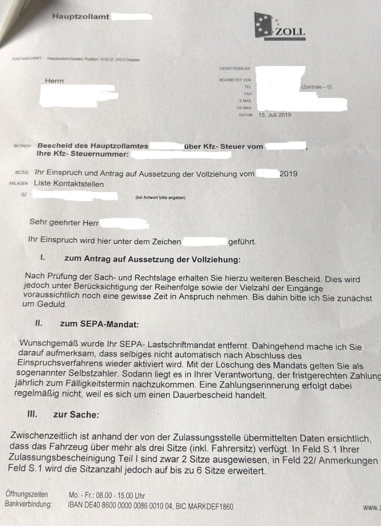 " Ich hatte das Problem auch. Mein ausführlicher Einspruch samt Bildmaterial wurde zunächst abgelehnt. Habe, wie du, 4 Sitze, in der Zulassung steht "Je nach Ausführung 1-6 Sitzplätze". In der Ablehnung hat man mir mitgeteilt, dass ich samt TÜV-Gutachten eine Umschreibung der Sitzplätze bei der Zulassungsstelle veranlassen soll.Dann habe ich mit der Zulassungsstelle telefoniert. Der Leiter sagte mir, dass MB für alle Varianten, sprich unterschiedliche Anzahl tatsächlicher Sitzplätzen, nur eine Typengenehmigung gibt. Deshalb steht 1-6 Sitzplätze in der Zulassung. Zudem verstand derHerr die Aussage des Zolls nicht, da es in solchen Fällen eine klare Absprache der Vorgehensweise gibt. Mit diesem Wissen hatte ich wieder 2 Telefonate mit dem Zoll. Aussage vom Zoll "Wir haben aktuell über 3.000 Einsprüche, sodass wir grundsätzlich erstmal eine Ablehnung schreiben". Freundlich, aber bestimmend, habe ich um einen Vermessungstermin gebeten. Dann hat man mich zur Rechtsabteilung verbunden. Die ganze Story von vorne, aber dafür hatte ich mal eine kompetente Dame am Telefon. Erneut bat man mich, bestimmte Fotos zu schicken. Das tat ich dann per email und am nächsten Tag teilte man mir mit, dass man anhand vermessener Vergleichsfahrzeuge den LKW steuerlich jetzt wieder LKW sein lässt und dass ich den neuen Bescheid bald bekomme. Auf meine Nachfrage, ob dieses dann jetzt für die Folgejahre gilt und so abgespeichert sei', kam ein "Das kann ich Ihnen nicht sagen".