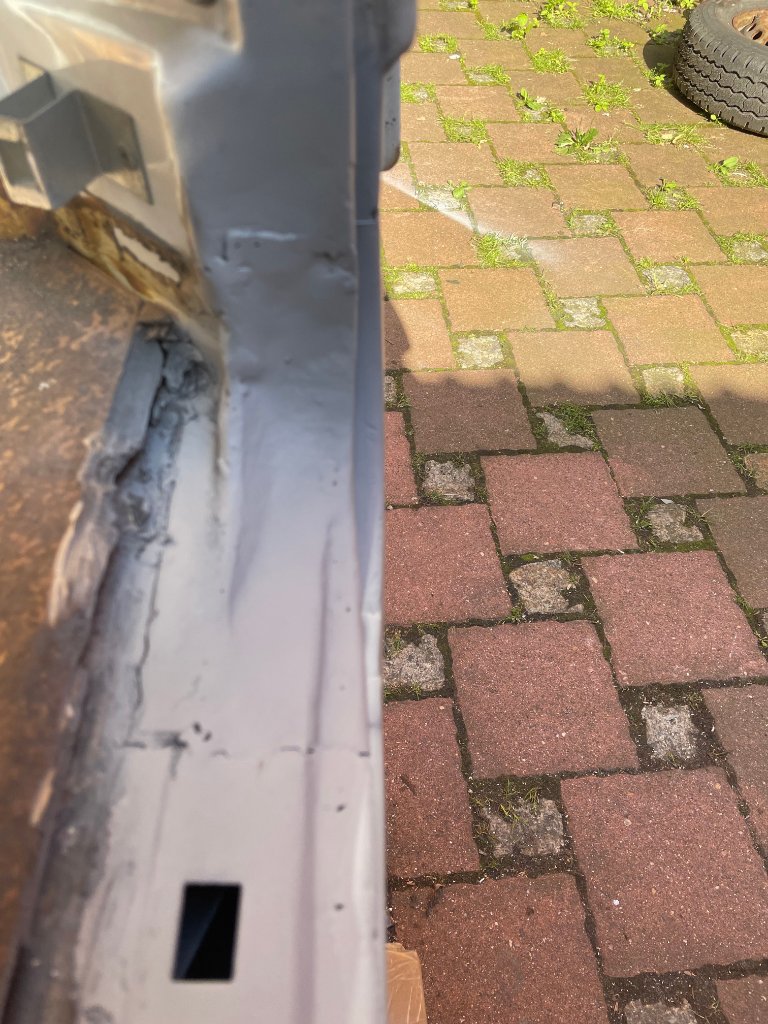 In dem Bereich des Heckabschlussbleches sammelt sich sehr viel Sand und sonstiger Dreck. Hier habe ich sehr lange mit Druckluft alles herausgepustet bis nichts mehr herauskam. Dann alle Holräume sehr sorgfältig mit Holhlraumwachs ( Vaselinemischung ) konserviert. Der Erstbesitzter hatte dieses schon bei dem Fahrzeug als Neuwagen durchführen lassen. Eventuell steht der Kasten deshalb noch so gut da.