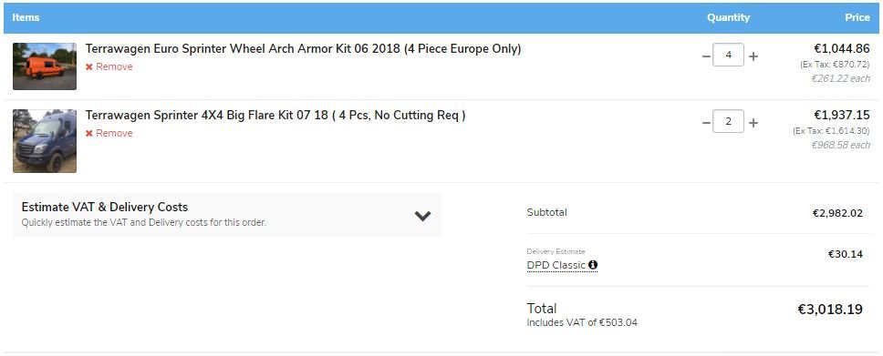 We can offer you Terrawagen Euro Sprinter flare arch kit for £210 (£22.99 of each set). And £30 off the big flare kit. With the imminent departure from the EU these prices will be changing again soon I’m afraid.Hast du da mal spasseshalber eine grouped purchase reduction Email-Anfrage hin geschickt?
