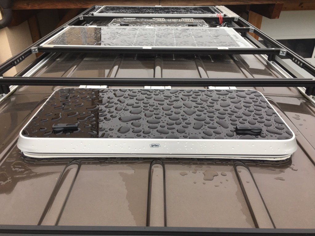 ) stehen nicht über den Dachträger über. Jetzt werden die freien Flächen auf dem Dach noch mit Alu-Riffelblech abgedeckt (kommt im Frühjahr an die Reihe....). Dann könnte ich das Dach als Aussichtsplattform benutzen. Die Solarmodule (Solara S-Seria Vision) sind ebenfalls begehbar.