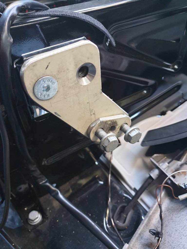 Ich habe die vordere Schraube durch das Handbremscenter gesteckt und statt in das vordere Befestigungsloch unterhalb der Adapterplatte gekontert. Die hintere Schraube normal in die richtige hintere Befestigungsbohrung und festgezogen. Fazit: Im entlasteten Zustand ist der Handbremshebel vorne fast auf dem Boden; im angezogenen Zustand schwenkt die Drehkonsole noch mit genug Abstand über den Bremshebel. Den Zug brauchte ich nicht zu ändern, etwas in den Untergrund zurückdrücken reicht.