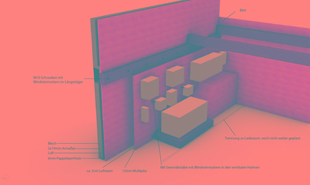 Ich habe den Aufbau vom TE auch nicht als Schaltschrank mit darin offenen erreichbaren Anschlüssen betrachten, sondern als Zusammenstellung mehrerer miteinander verbundener Geräte. Alle Anschlüsse führen in die Geräte hinein und sind abgedeckt. Die Verbindungsleitungen dürfen, da sie alle gegen Überlast abgesichert sind (Forderung nach DIN VDE 0100-721), über Holzwerkstoffe geführt werden. Auch die strikte Trennung von 12V und 230V Kreisen liegt vor.