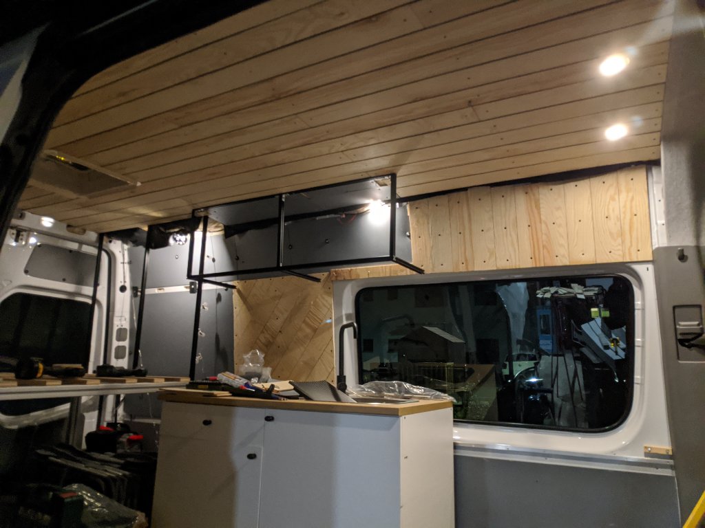 Heißt neue Wand und Deckenverkleidung, neue Möbel und ein permanentes Kinderhubbett über der Fahrerkabine.