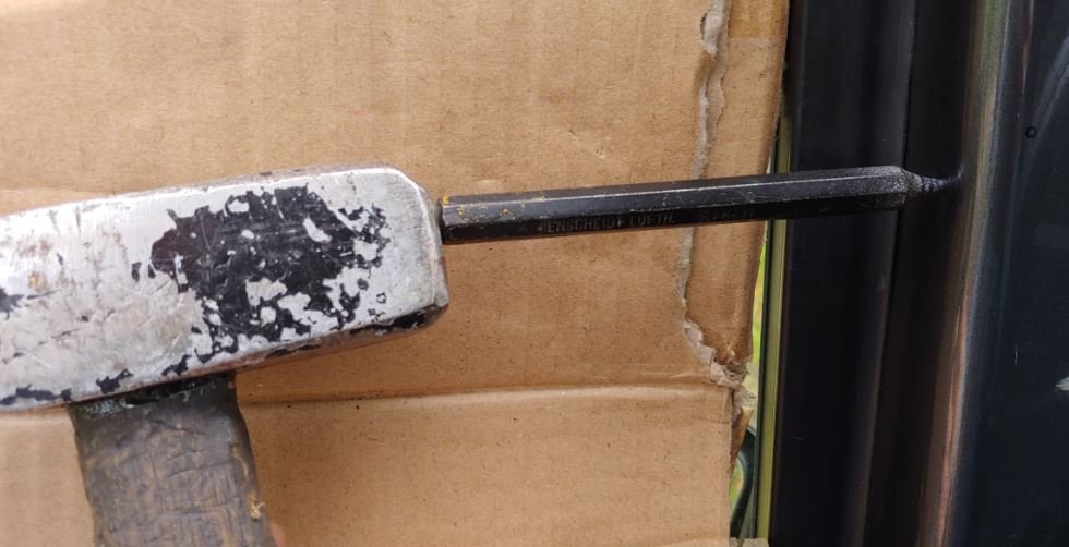 Statt Bohrmaschine und Einziehmuttern nutze ich den Dorn und treibe ihn mit einigen Hammerschlägen ein Stück weit ins Blech.