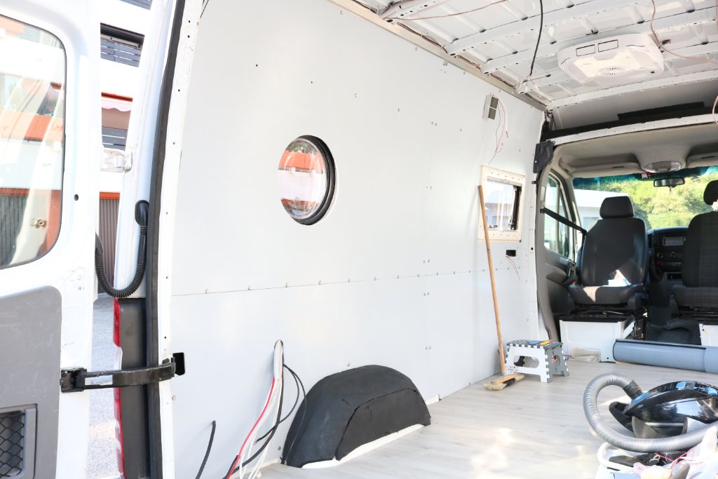 Nach verlegen aller Kabel, isolieren mit Armaflex, Einbau diverser Fenster kammen dann wieder die aufbereiteten Seitenwände (spachteln, schleifen, lackieren) wieder dran.