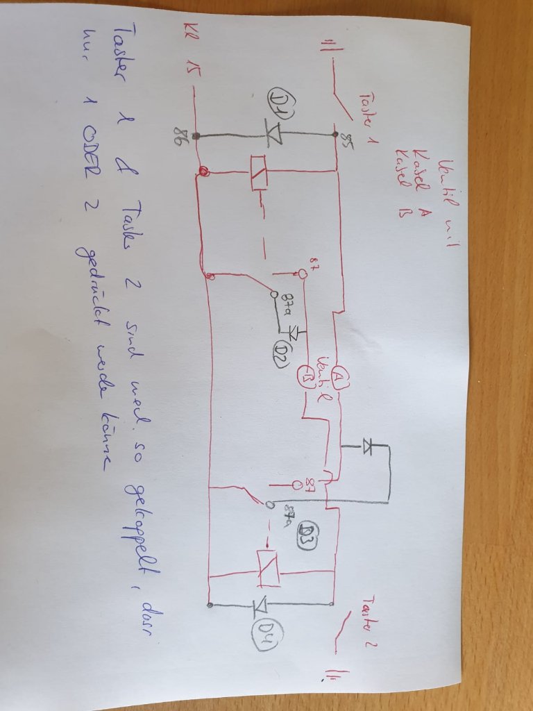 Di anderen beiden Dioden sind so nutzlos. Die Dioden sollen ja den durch eine Schalter initierten Stromfluss aufrecht erhalten, auch wenn der Schalter los gelassen wird. Schau dir das Ganze mal beim Relais bei Diode 1 an. Wenn du Taster 1 Drückst, fließt ein Strom von Kl15 über 86 durch das Relais, über 85 und den gedrückten Schalter nach Masse. Wenn du den Schlater los lässt, geht das nicht mehr. Der Stromfluss der durch die Spule aber weiter aufrecht erhalten wird (bis das Magnetfeld abgebaut ist) will irgendwo hin. Durch die Freilaufdiode DI