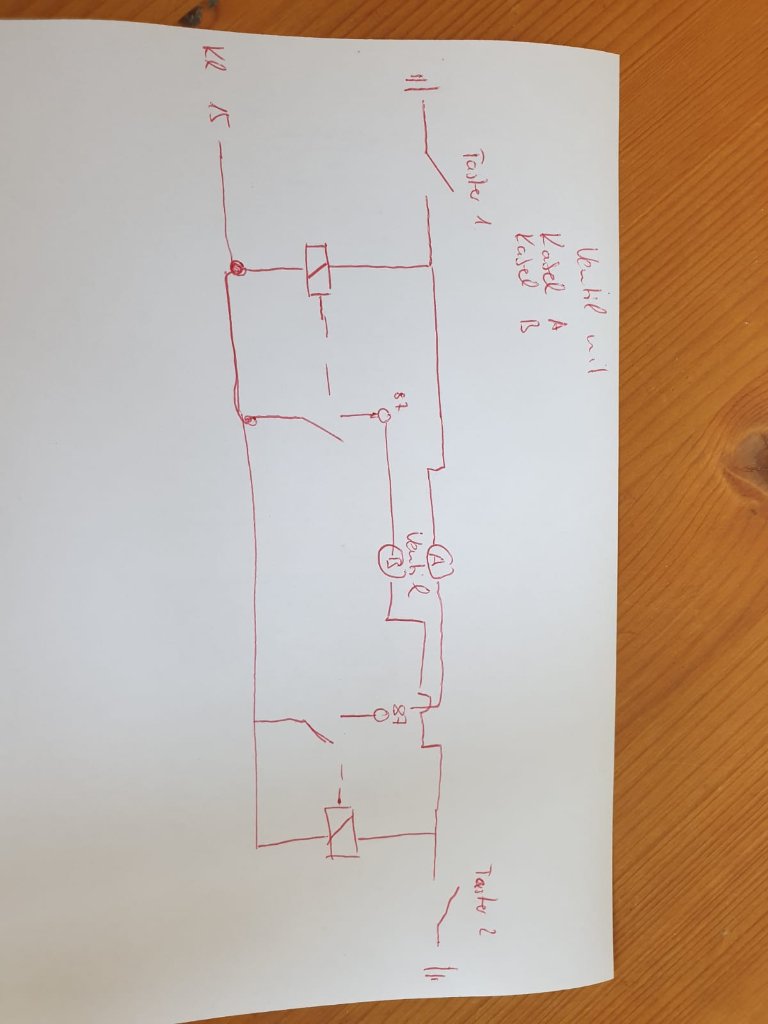 Di anderen beiden Dioden sind so nutzlos. Die Dioden sollen ja den durch eine Schalter initierten Stromfluss aufrecht erhalten, auch wenn der Schalter los gelassen wird. Schau dir das Ganze mal beim Relais bei Diode 1 an. Wenn du Taster 1 Drückst, fließt ein Strom von Kl15 über 86 durch das Relais, über 85 und den gedrückten Schalter nach Masse. Wenn du den Schlater los lässt, geht das nicht mehr. Der Stromfluss der durch die Spule aber weiter aufrecht erhalten wird (bis das Magnetfeld abgebaut ist) will irgendwo hin. Durch die Freilaufdiode DI