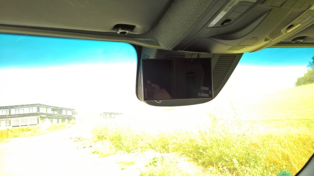 Achso, und so sieht mein Blick vorne aufs Navi aus. Ich habe das Teil gerne im direkten Blickfeld, sodass man nur die Augen, nichtmal den Kopf drehen muss um darauf zu blicken. Und Alles was mir noch irgendwo weiter das Sichtfeld verkleinert mag ich überhaupt nicht. Mir geht dieser gigantische Plasteverhau da oben in der Windschutzscheibe so schon gewaltig auf den Keks, jedenfalls ist er riesig genug um das gesamte Navi zu verdecken.