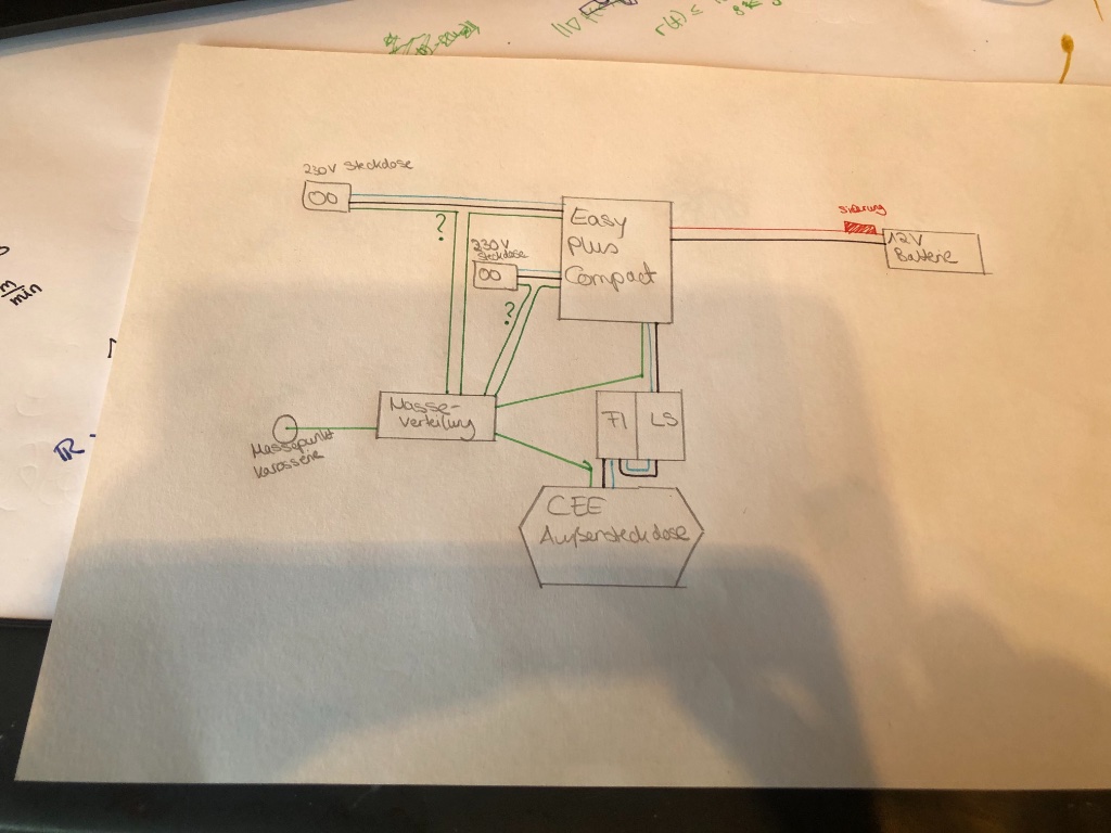 ich plane in meinem Camper (Crafter Baujahr 2013) eine 230V Installation. Dazu möchte ich die EasyPlus Compact 12/1600/70 verbauen. Wie ich die Außensteckdose und die Batterie an das Gerät anschließe habe ich verstanden. Lediglich die Erdung macht mir Probleme. Wenn ich an den AC Out Ausgängen eine 230V Steckdose anschließen möchte, muss ich dann das PE Kabel auch an die Karosserie anschließen? Ich habe dazu meinen Schaltplan angehängt und bei den Anschlüssen, bei denen ich mir unsicher bin ein Fragezeichen eingezeichnet.