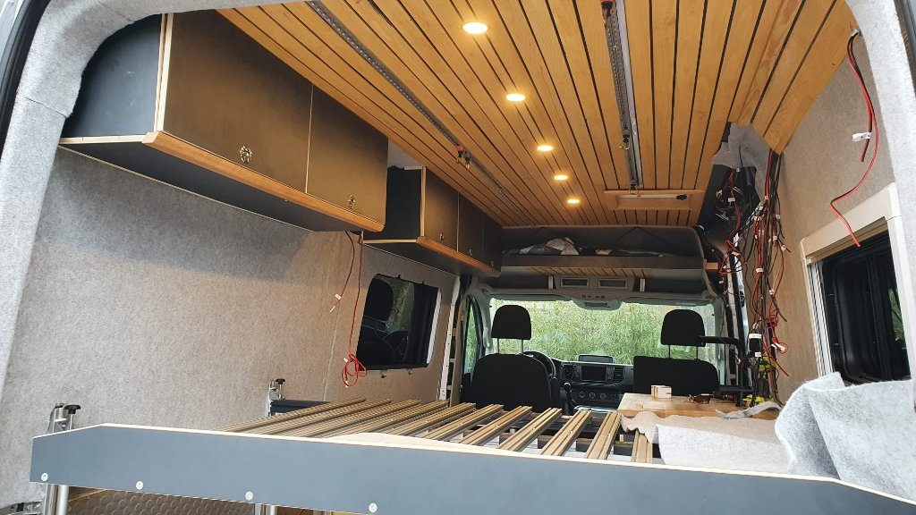 Ablagefach im Fahrerraum ging recht fix. Von der Optik bin ich mir noch nicht so sicher. Ich könnte jetzt sagen, dass ich versucht habe zwischen dem Filz an der Wand und dem Holz an der Decke zu vermitteln - wäre auch nicht ganz gelogen. Aber Hauptgrund für den Mix war eigentlich, dass ich nur noch Reste verbastelt habe, und für nur Filz oder nur Holzleisten hatte ich zu diesem Zeitpunkt von beidem nicht mehr genügend Material :-) Die Abdeckleiste ist noch nicht angeschaubt, das mache ich erst dann wenn die Oberschränke hängen und ich mir sicher bin, dass das alles an den Schnittstellen gut zusammenkommt.