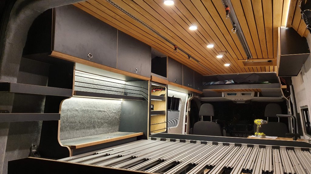 Das Schaltergehäuse ist noch nicht final, dient erstmal nur zum Test. Die Aluprofile, die als Gleitschinen dienen, muss ich auf der Beifahrerseite nochmal ordentlich verkleiden. Ansonsten ist das System aber fertig und funktioniert super, sogar mit mir knapp 100kg Luftikus auf der Bettfläche.