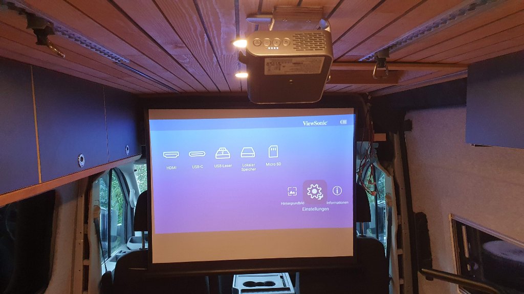 Das Wetter ist kalt und nass, und daher beschränken sich die Baufortschritte auf seeeeehr kleine Schritte. Als kleines Gimmick nun das "Heimkino". Eine kleine Halterung zum schnellen EInhaken des recht kleinen aber feinen Viewsonic M1, und eine ausziehbare Leinwand, beides kann in ca. 10sek auf-/abgebaut werden. Den Beamer gibts gebraucht recht günstig, und der Ton ist auch ohne Bluetooth-Box deutlich besser als erwartet.