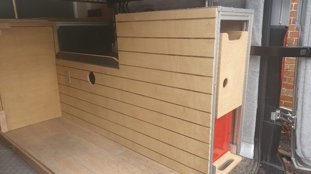 In dem entstandenen Stauraum vor diesem "Schubladengestell" sind unter einer Serviceklappe der Frischwassertank und Pumpe mitsamt der Wasserleitungen und Absperrventile verbaut, sowie die Standheizung. Eine "Belüftungsöffnung" an Seite muss ich noch mit einem entsprechenden Lüftungsgitter versehen. Die Serviceklappe ist recht stabil und mit einer rutschhemmenden Matte beklebt, so dass es als Ablage für größere Taschen, Gitterboxen o.ä. dient, an die man nicht so oft herankommen muss.