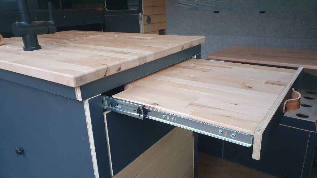 Für Werkzeug (MTB), Einkäufe und anderes loses Zeugs habe ich an der Hecktür eine kleine Schublade sowie einen Lastauszug eingebaut. Die Höhe ist von der niedrigsten Position des höhenverstellbaren Bettgestells vorgegeben.