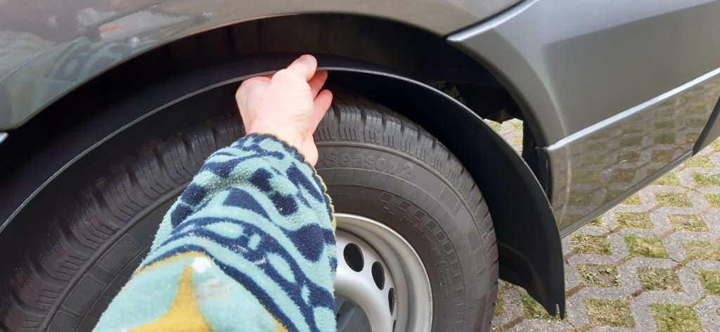 und dann mit Paketkleber grob fixiert. Um mehr Stabilität zu erreichen habe ich mit Kaminholz den Innenkotflügel zwischen Reifen und Radlauf verklemmt.