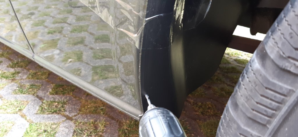 Dann Entgraten des Bohrloches im Kunstoffkotflügel und das Metallbohrloch.