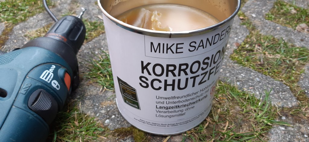 Das Bohrloch wird mit Mike Sanders verfüllt. Ich habe auch den Radlauf von hinten, da, wo die Schraube wieder austritt, dick mit Mike Sanders verschmiert.