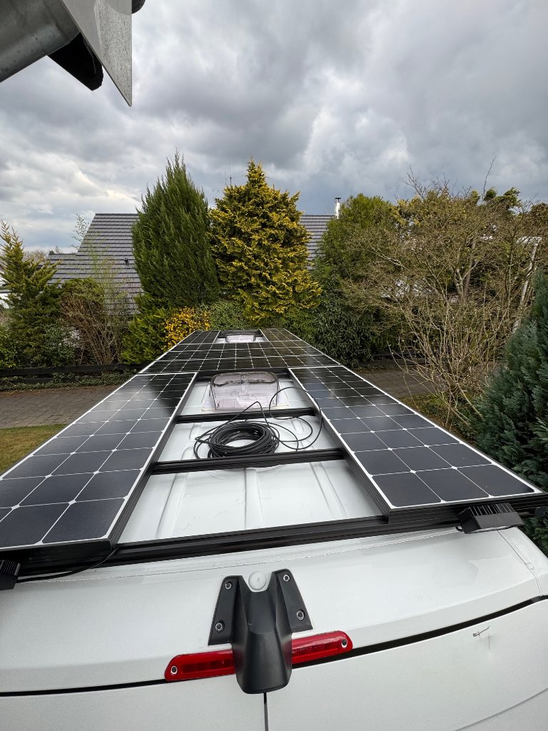 Nun habe ich ein Dachträger aus Aluprofilen gebaut und dort die Solarpanels als auch die Winkel mit Edelstahlschrauben A2 in verzinkten Nutensteine geschraubt und auch mit Loctite gesichert.