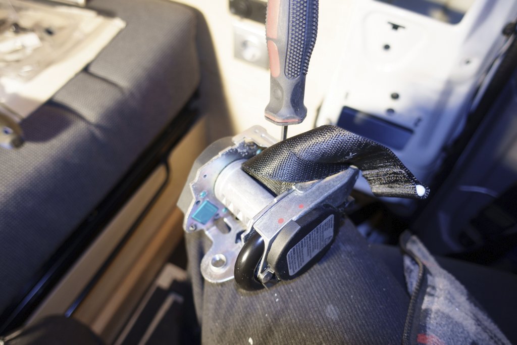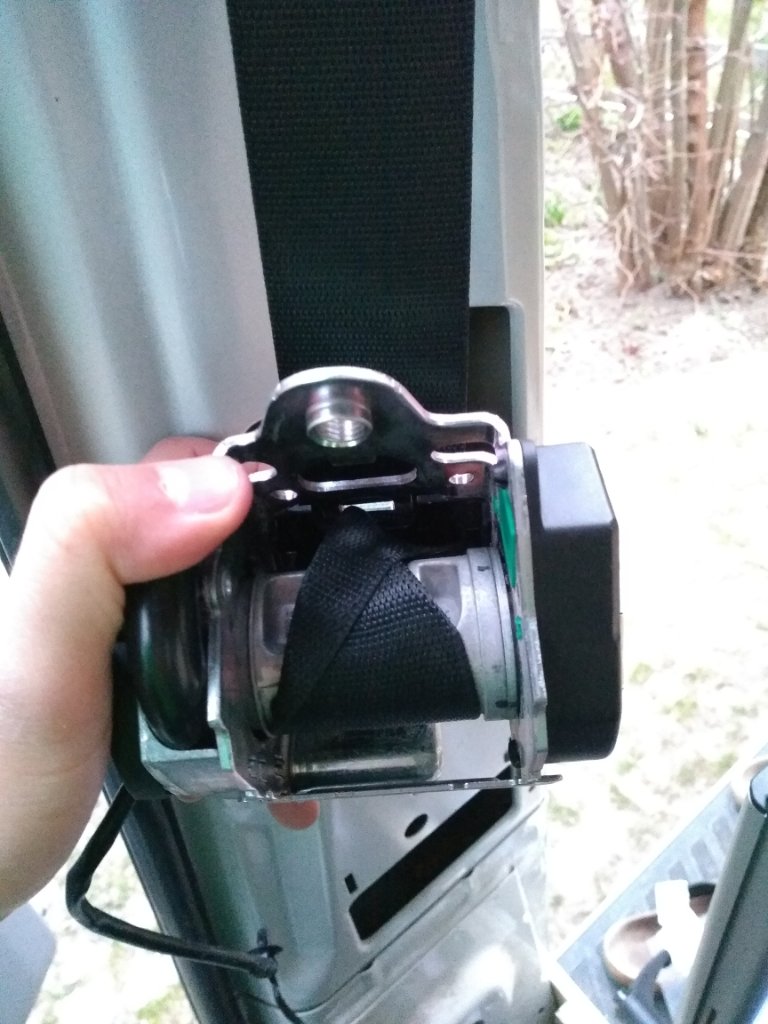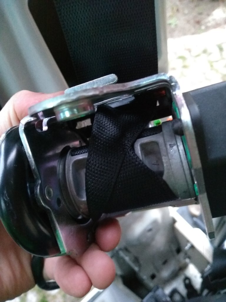Ich hab den Gurt einfach etwas weiter aus der Rolle gezogen und dann dieses Teil einfach um eine halbe Umdrehung gedreht. Dann habe ich den Gurt wieder langsam zurückgezogen. Der Spalte in der Rolle ist groß genug, dass der Gurt kurzzeitig doppelt durchpasst. Hier noch ein Bild dazu: