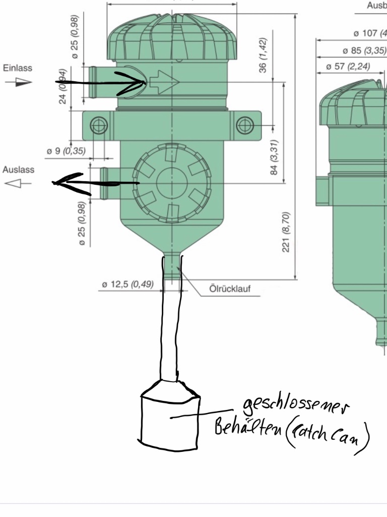 Also so wie Lars es in seiner zweiten Skizze dargestellt hat. Der bereits erwähnte durchsichtige Schlauch und daran befindlich ein Fläschchen, neudeutsch Catchtank.