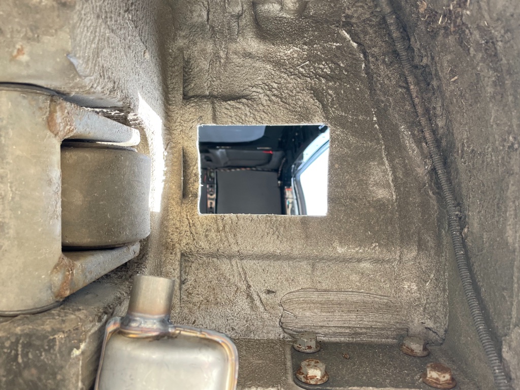 Ja, Auspuff zeigt nach hinten, bis zum Fahrzeugende/Wo die Trittstufe anfängt.
