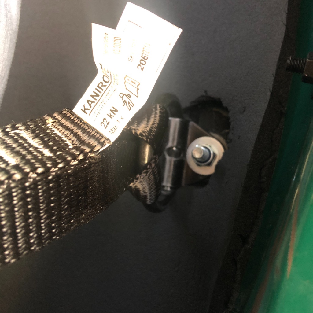 Außerdem zweite Verteidigungslinie für das Hubbett: Sicherheitsgurte mit Prüfzeichen und Schlaufen. Verlängert mit einem 22kN Gurtband. Schlaufe um original Zurröse durch das Dach mit M8 geschraubt, Löcher für C-Schiene genutzt.