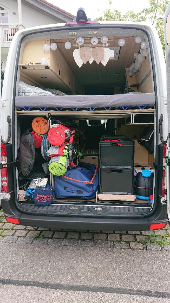 Mein Fazit vom Ausbau: vieles was man das erste Mal macht ist Fehlerbehaftet. Für den ersten Ausbau ist es aber aus meiner Sicht sehr gut gelungen. Was ich unterschätzt habe ist tatsächlich das Bett: wir liegen diagonal im Bett, was aber am Anfang ein wenig gewöhnungsbedürftig war. Anders gegangen wärs aber nicht, wenn man die Bretter im Bus transportieren will. Aber es hat funktioniert und viel wichtiger: auch im Einsatz bewährt! Das Equipment ist sehr kompakt gepackt und schnell hinten rausgezogen. Stauraum haben wir auch auf Grund der sehr großen Oberschränke mehr als genug, was fehlt und was ich hätte anders bauen sollen: kleinere Schubladen und Staumöglichkeiten, bei uns ist alles recht groß dimensioniert. Glücklicherweise hat meine Frau ein Händchen fürs packen