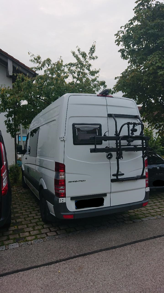Und zu guter Letzt: wir haben dann doch den Radlträger hinten dran gebaut. Den Thule Van Elite XT. Statt dem Fahrradauszug hinten drin, ist ein Auszug für Eurokisten reingekommen, auf den Auszug kann ich allerdings die Gabelaufnahmen für die Räder auch anbauen, sodass wir jetzt sogar Platz für 4 Räder haben.