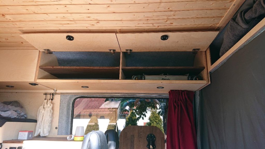 Die Oberschränke haben noch Zwischenböden bekommen. Außerdem haben wir noch einen supergeilen Stoff gefunden, der klasse aussieht und blickdicht ist sowie keinerlei Knittertendenz hat