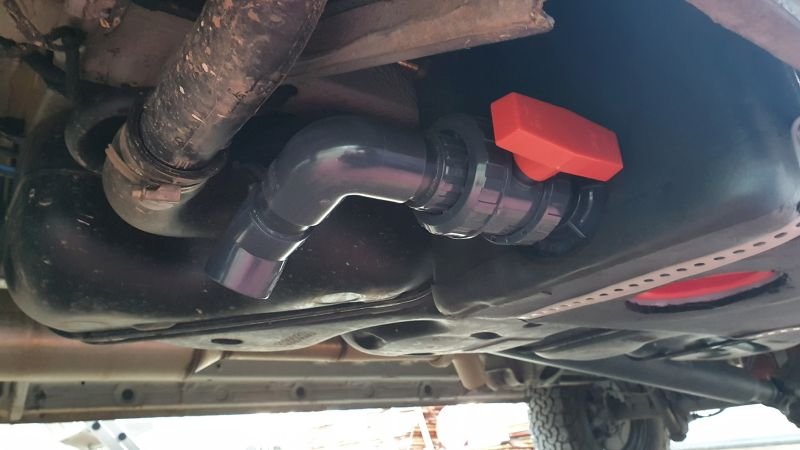 Noch 2 Worte zum Volumen. Ja 175 l sind viel, aber man muss den Tank nicht immer komplett füllen. Und wenn man auf größeren Etappen unterwegs ist, ist man froh wenn man ein paar Liter mehr im Tank bunkern kann! Ein besonderes Feauture ist: Die Wasserentnahme erfolgt durch ein Rohr im Inneren das bis in den Auslauf geführt ist. So kann der Tank bis auf wenige Centiliter geleert werden. Der Auslauf ist an der Trittstufe im Innenraum. Zum Entleeren wird einfach ein 40 mm Schlauch auf den Absperrhahn gesteckt und derTank an der Schiebetüre entleert.