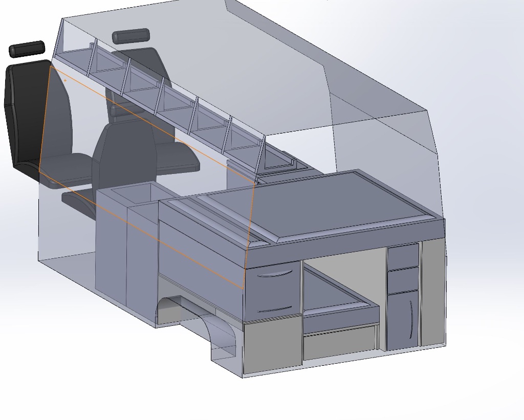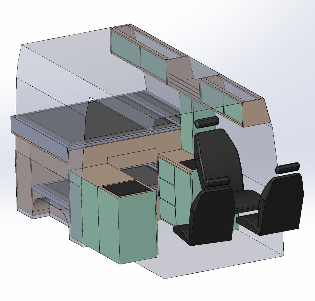 Der Tisch kommt wahrscheinlich an die Wand auf der Fahrerseite zwischen dem Fahrersitz und dem dritten Sitz. Dort ist der unseres Hymers auch angebracht. Wenn er nicht benötigt wird, wird er herunter geklappt. Die Platzverhältnisse sind von unserem jetzigen Camper 1:1 übernommen.