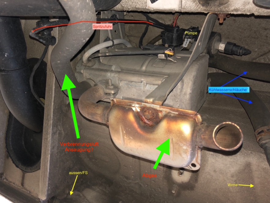Die Luftansaugung erfolgt über den Gummischlauch im Rahmen. Man könnte den Ansaugschlauch vom 2. Heizgerät der 10kw-Wasserheizung nutzen. Damit wird syphonartig Luft von unten angesaugt. Da könnte man sicherlich einen Schalldämpfer anbauen. Aber ob das was bringt... Ist halt eine wassereizung. Da zählt Leistung im Kurzzeitbetrieb. Geräuscheindämmung ist da sicher mit das Letzte was im Lastenheft stand.