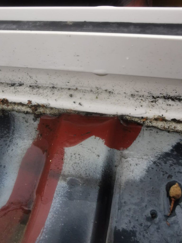 So sah die Eintrittstelle aus, wir hatten auch das Problem mit dem Blindstopfen hinten Mitte welcher undicht geworden ist, wir haben das versucht mit Dekseal zu dichten, leider ohne Erfolg. Dort klebt jetzt ein Butyl Dachpflaster drauf.