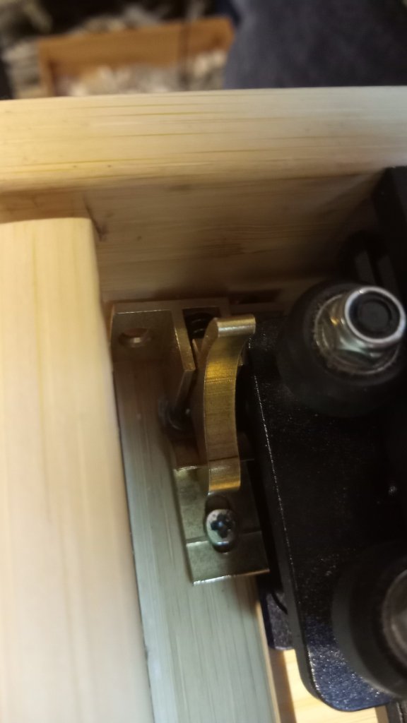 Die Schienen werden nun über die Ankerplatten mittels normaler Holzschrauben mit der breiten Tischplatte verschraubt. (hier wieder von unten im Bild)