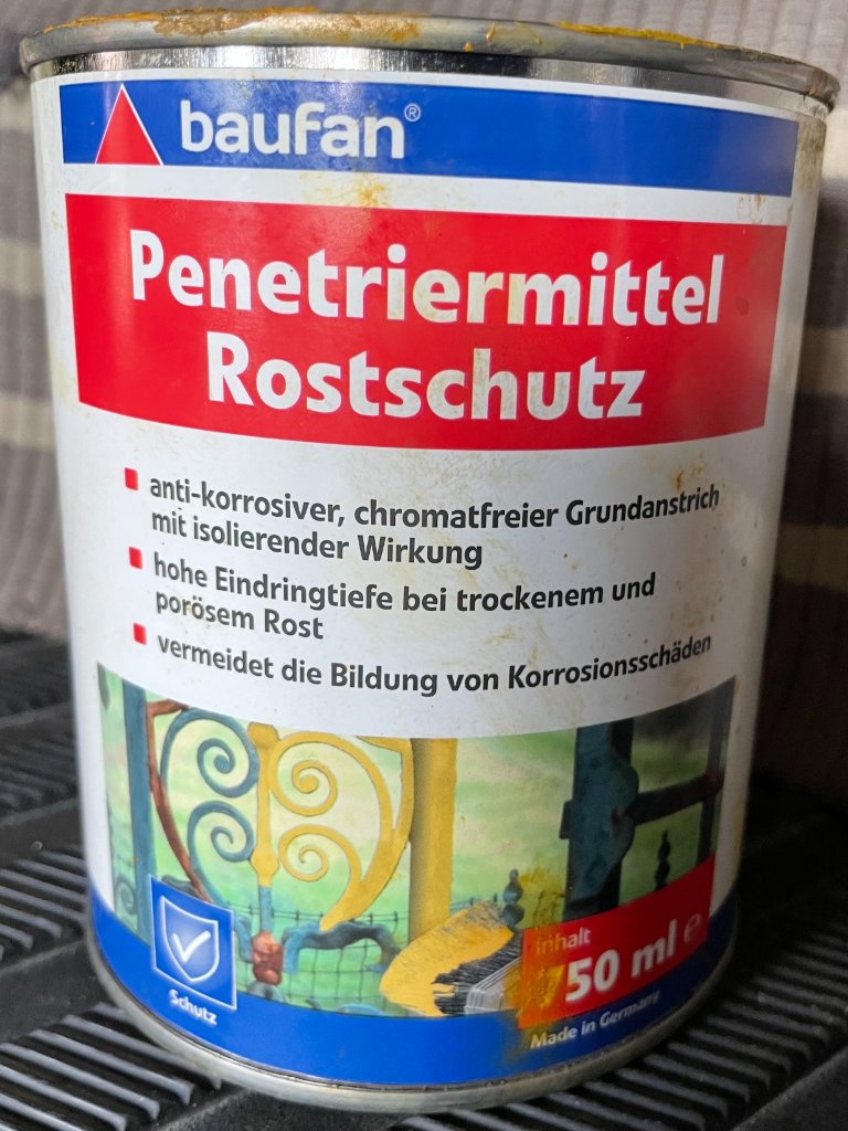 Nunmehr würde/will ich penetrierende Rostschutzfarbe darauf streichen, um zu sehen und bestenfalls aufzuhalten, ob/daß es weiter gammelt. https://www.hoepner-lacke.de/produkt/penetriermittel/