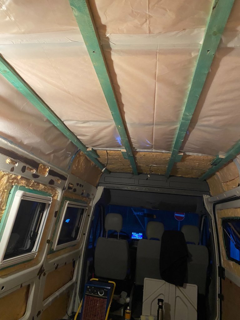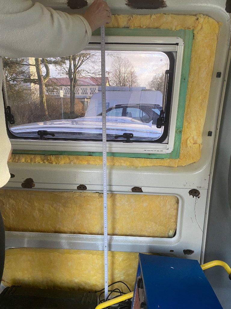 Mittlerweile sind doch einige Sachen passiert und es geht voran. Vier Fenster sind drin. Da ist meine Wahl auf Carbest gefallen. Super ist die Fieberglas-Wolle als Dämmung. Sie kommt aus der Luftfahrt und ist ultra-leicht. Lässt sich auch prima verarbeiten. Und hat mit einer Dicke von 26 mm die gleichen Iso-Werte wie 8 cm Styropor. Davon habe ich überall zwei Lagen eingebracht.