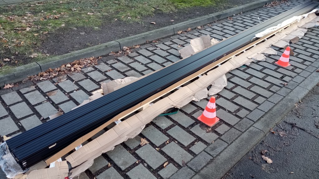 Träger bis nach vorn durch. Mal schauen. Statt der meist verwendeten eckigen 4040 Profile will ich auf dem Dach die