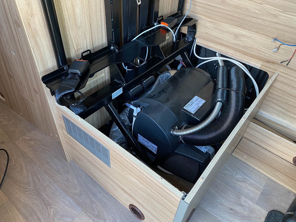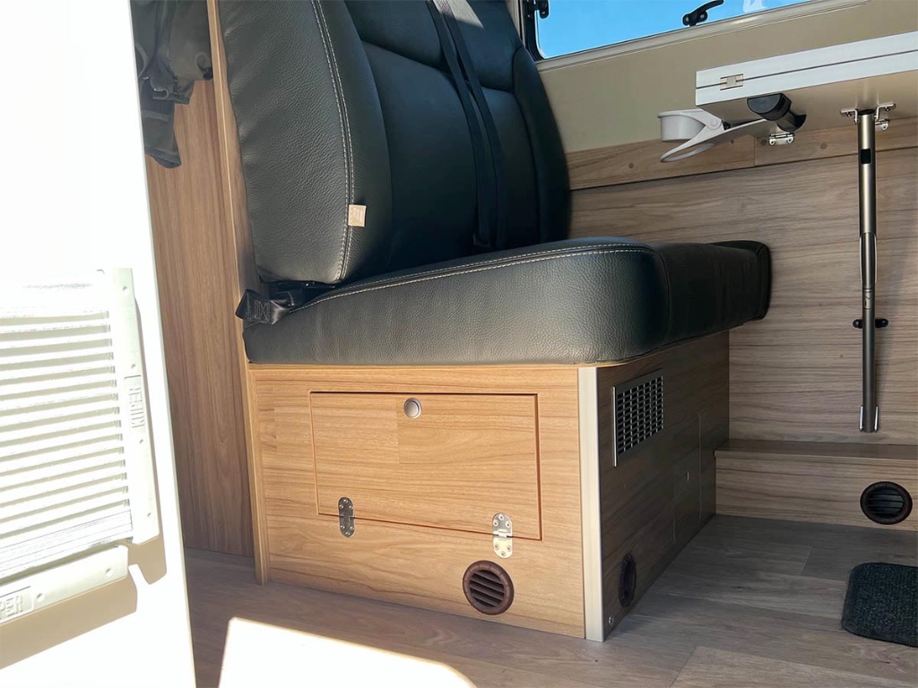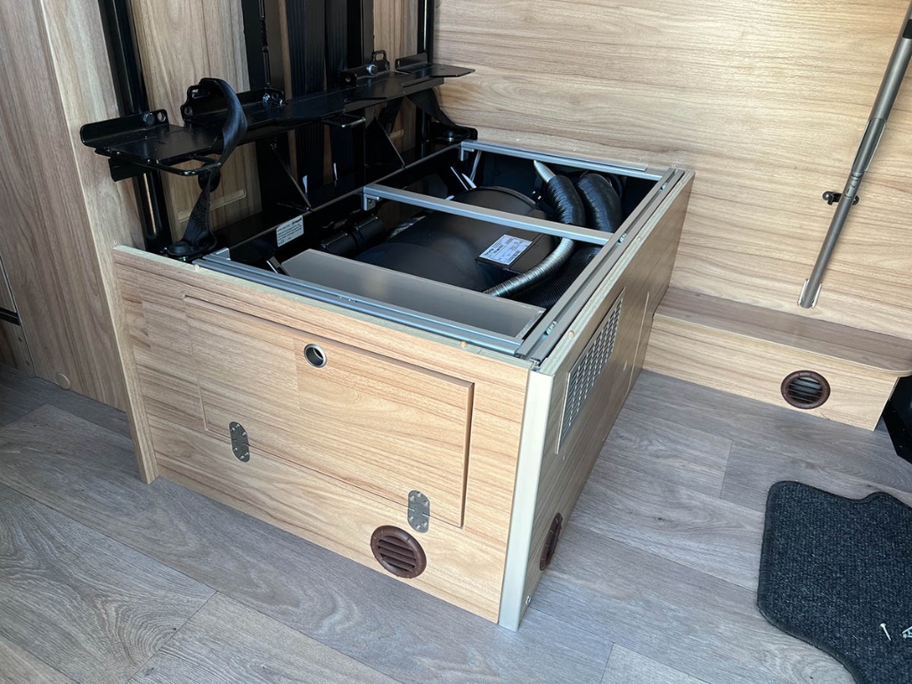 1. Absatz unterhalb des Klapptisches. Bestellbar beim großen Versandhaus mit dem "A". Befestigt mit 3M Klebepad und damit einfach entfernbar. Passt genau drunter und bietet Platz für allerlei Kleinkram. Der Schalter für den Höhenkit der Dieselheizung ist auch noch erreichbar.
