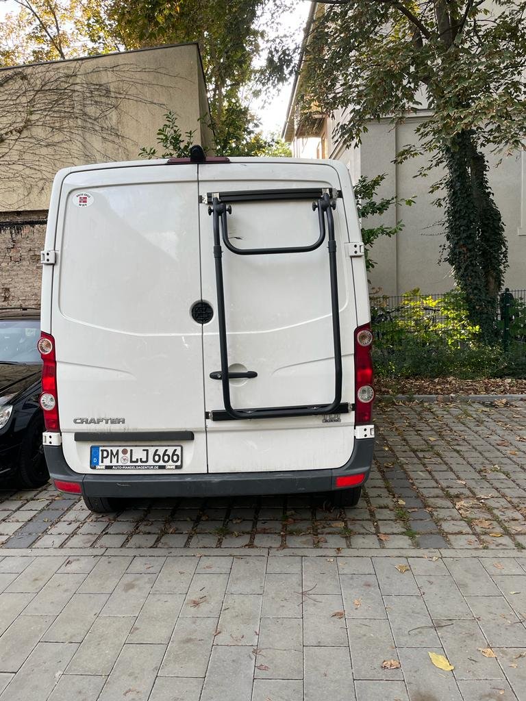 Zwei Airlineschienen an die Tür. Oben eine Gabelhalterung an einem Winkel. Unten zwei Winkel mit einem U-Profil, wo das Hinterrad drin steht. Verzurren mit kräftigen, wiederverschließbaren Kabelbindern oder Gurten. Man muss nur sicherstellen, dass die Beleuchtung nicht verdeckt wird. Vorteil wäre, es baute praktisch nicht auf und die zweite Tür bliebe fei - z.B. für eine Leiter.
