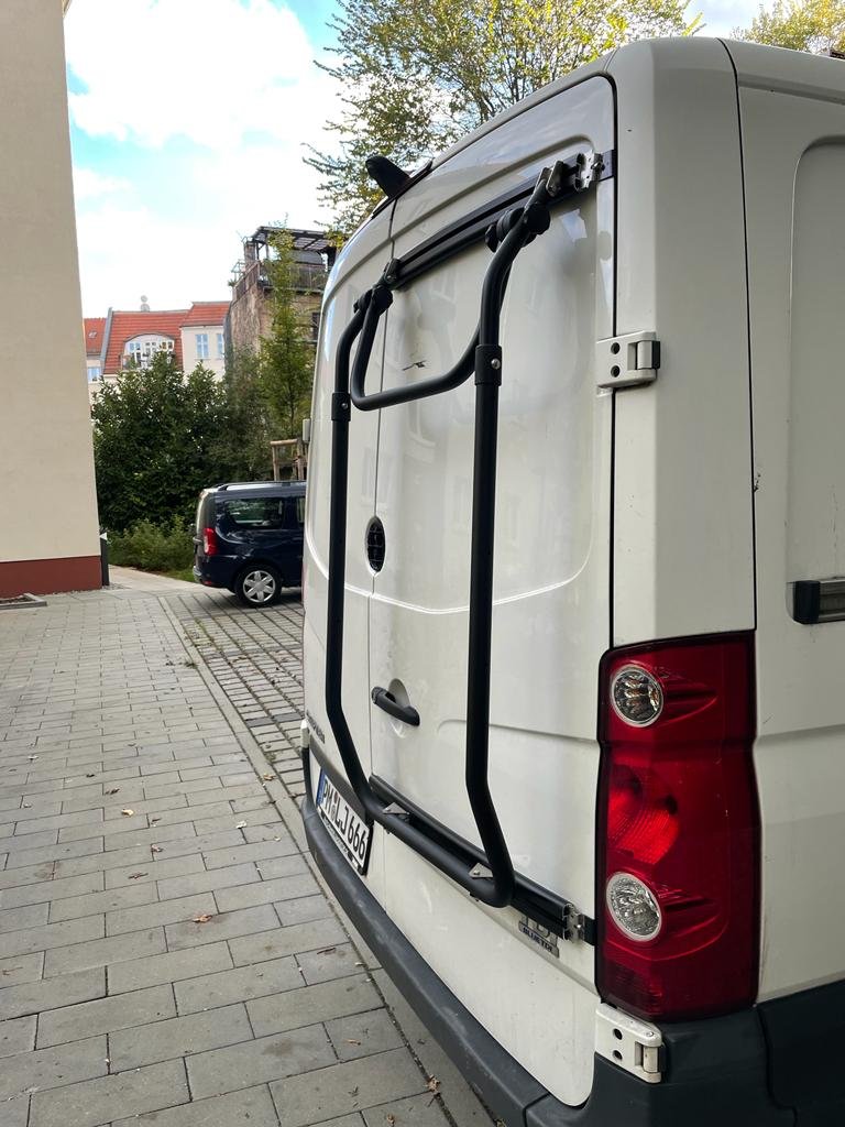 Zwei Airlineschienen an die Tür. Oben eine Gabelhalterung an einem Winkel. Unten zwei Winkel mit einem U-Profil, wo das Hinterrad drin steht. Verzurren mit kräftigen, wiederverschließbaren Kabelbindern oder Gurten. Man muss nur sicherstellen, dass die Beleuchtung nicht verdeckt wird. Vorteil wäre, es baute praktisch nicht auf und die zweite Tür bliebe fei - z.B. für eine Leiter.