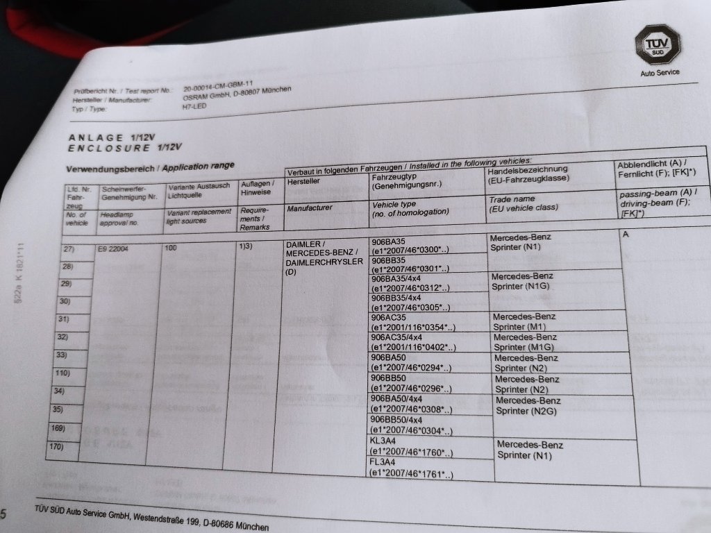 Fragt sich nur, welche 906 das genau sind. Die Scheinwerfer-Gen.Nr. E9 22004 hat OSRAM auch früher schon für die 907/910 genannt. Ich bin also verwirrt ... und kann grad nicht an mein Fahrzeug um die Scheinwerfer-Nummer meines MOPF-906 zu checken.ABG Nr. K 1821*11 für H7 LED.