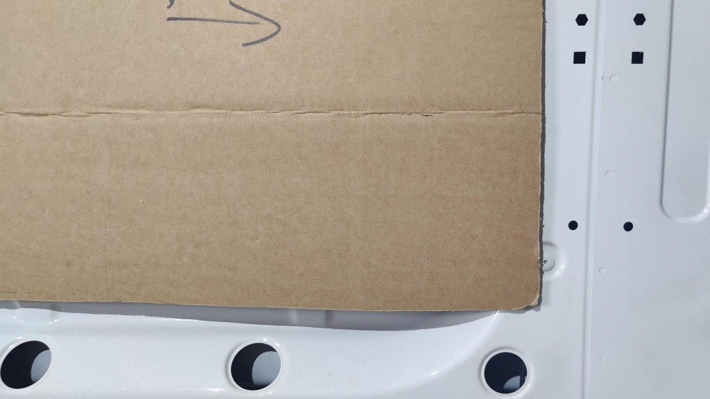 Wer beim Crafter II blind den YT-Videos vertraut, wo die Dinger in Sprintern eingebaut werde, erlebt sein persönliches Waterloo. Wenn es gerade werden soll, muss man sich an der Einprägung für die Schiebetürenschiene orientieren. Ca. 5mm Oberhalb der Kante habe ich den unteren waagerechten Schnitt gemacht. Die obere Parallele genau 53 cm von der unteren Kante. Dann kann man die Schablone für die Seiten und Rundungen anzeichnen. Beim Sprinter ist das Teil durchgehend an dem Doppelfalz verschraubt. Beim Crafter II nicht überall.
