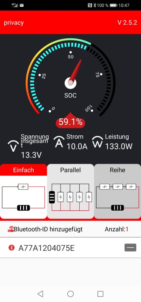 Zur BullTron App: Einfach, wenn du einen Akku hast, die anderen Optionen wenn du mehrere in Reihe oder parallel angeschlossen hast.
