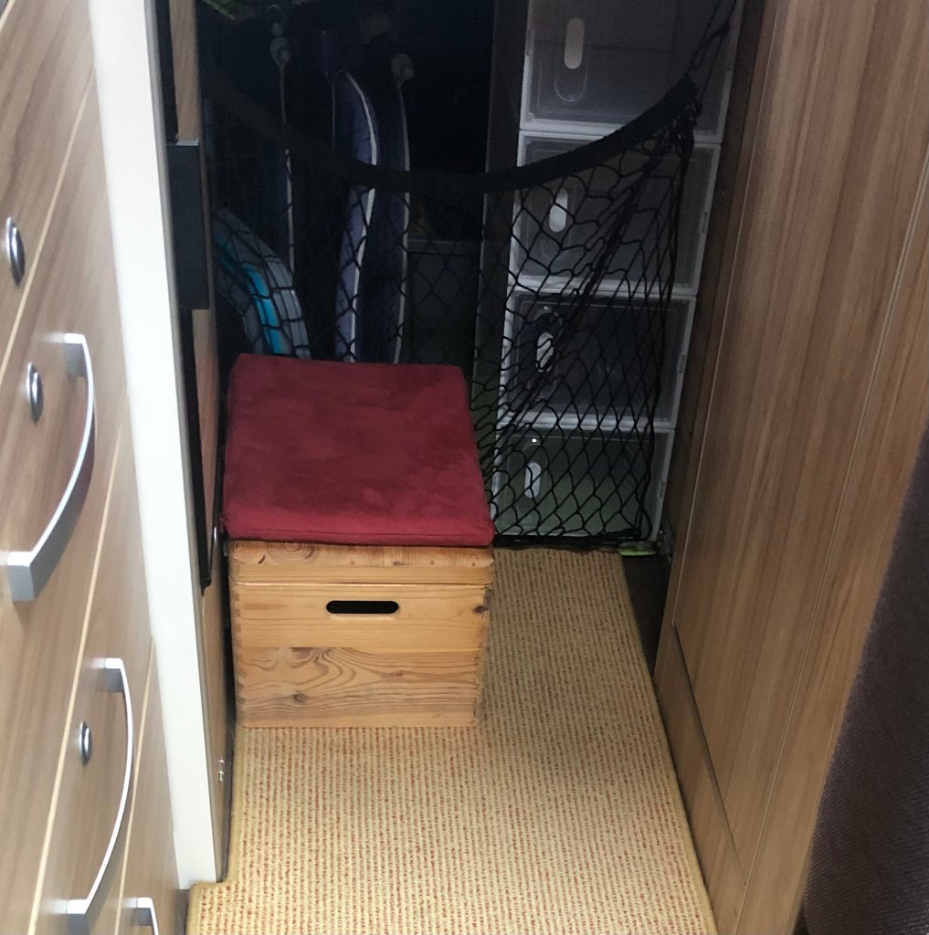 Ich hab damals ein Netz angebracht und das hat bisher alles gehalten und konnte leicht ausgehakt werden wenn man zum Schuhschrank (für die Schuhe die nicht in die Wurfkiste mit den Strandlatschen und den Sommerschuhen kommen) oder sonstwie in den Stauraum wollte.