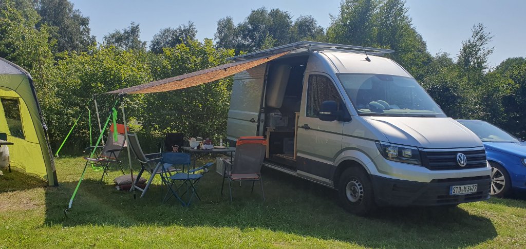 Dafür steht der Dachträger jetzt so weit über das das Wasser vom Dach nicht mehr in die offene Schiebetür tropft. Die Solarmodule bilden ein schönes Vordach.