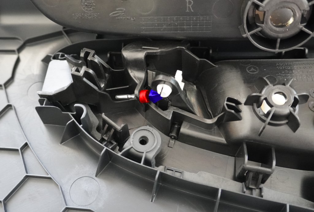 Ich habe das Bild extra mal in großer Auflösung hochgeladen und den Gummi- Puffer rot eingefärbt und das Innenteil vom Türhebel in blau. In echt sind beide Teile natürlich schwarz. das das Gelenk vom Hebel rechts vom blauen Teil sitzt, drückt das blaue Teil umso mehr auf den roten Puffer, je stärker der Hebel nach innen gedrückt wird.