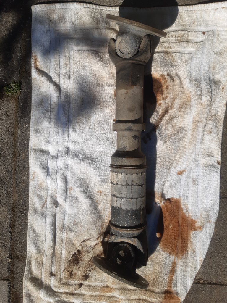 Also hab ich als erstes mal die Welle zwischen VTG und VA-Differential ausgebaut und zum Kumpel gebracht, der beim Gelenkwellendienst arbeitet. Der hat sie durchgekurbelt und gesagt, da fehlen keine Wuchtgewichte. Was auch immer da drauf geklebt war, es waren keine Gewichte, denn die werden gepunktet und nicht geklebt. Man siehts auf den Bildern.